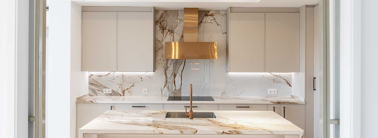 ECLÉCTICA sin miedo a combinar brillos con mates, cobres con acero. Es un desorden de materiales estudiado para conseguir el resultado de una cocina diferente y con mucha personalidad.